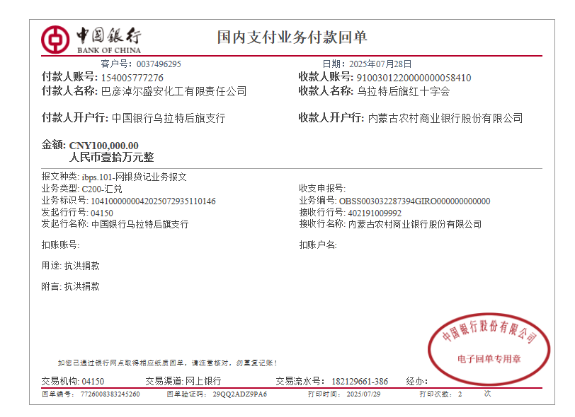 巴盛安緊急馳援周邊旗縣抗洪救災 彰顯本土企業擔當發布日期:2025-08-20近日,巴彥淖爾市烏拉特前旗、五原縣遭遇強降雨,引發洪水及冰雹災害,部分地區房屋受損、農田被淹甚至絕收,群眾生產生活受到嚴重影響,災情牽動著社會各界的心。作為本土規模以上企業,巴彥淖爾盛安化工有限責任公司第一時間響應號召,迅速行動,向烏拉特前旗、五原縣等受災旗縣捐贈善款,以實際行動助力抗洪救災。 -